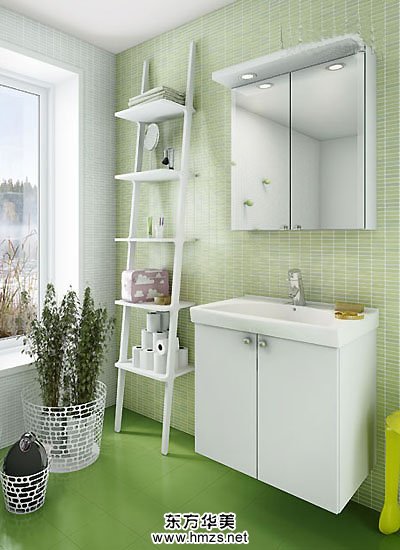 白色擱架幫助擴充浴室柜收納空間,簡練大方,在綠色地板的映襯下顯得更加潔白典雅。